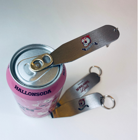 Stadig öppnare i metall för att snabbt öppna Läsk- Öl- Mineralvatten på burk tex på ett event eller för den som har svårt att öppna burken eller inte vill skada naglarna. Kombinera med ett logoband att hänga runt halsen.
