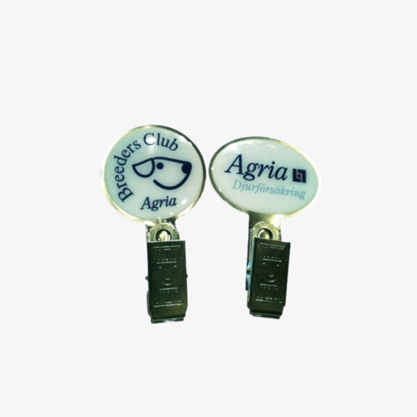 Märke med klämma samt tryck att fästa din nummerlapp på vid t.ex. hund- hästtävlingar och uppvisningar. Baksidan är försedd med en säkerhetsnål och fram finns en stark klämma i metall att fästa nummerlappen med.