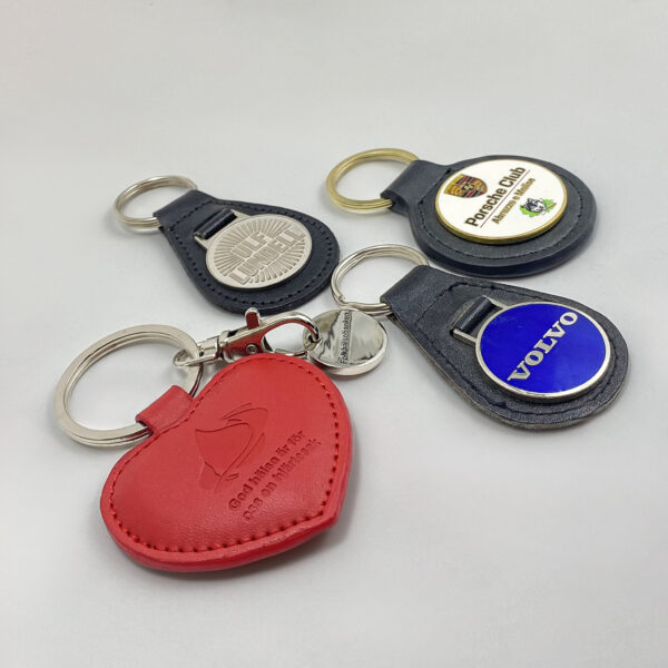 Specialtillverkade Nyckelringar i Skinn alt. Veganskinn. Med eller utan metallmärke. Valfri form. Pris efter design, storlek samt antal.