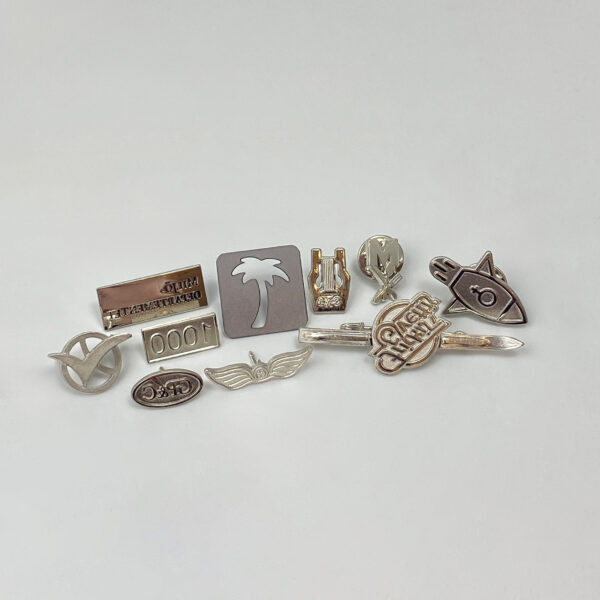 Sobert märke utan emaljfärg. Lämpar sig väl att stansa efter en detaljerad design. Upphöjd metall poleras blank och nedsänkt metall mattbehandlas (textur) för att skapa en kontrast mellan de båda nivåerna.